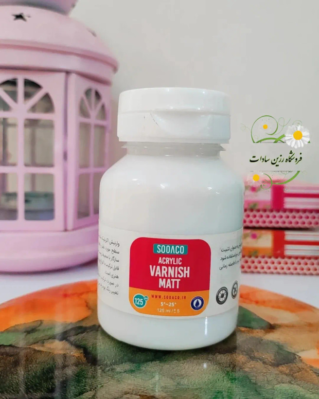 | وارنیش پایه آب مات سوداکو | وارنیش اکرولیک مات، سبب مات شدن نسبی سطح مورد نظر و فاقد طیف رنگی است. قابل ترکیب با انواع پودرها و مناسب تثبیت تکنیک های هنری است. . در حجم 125میل